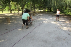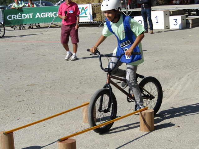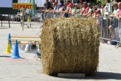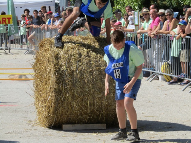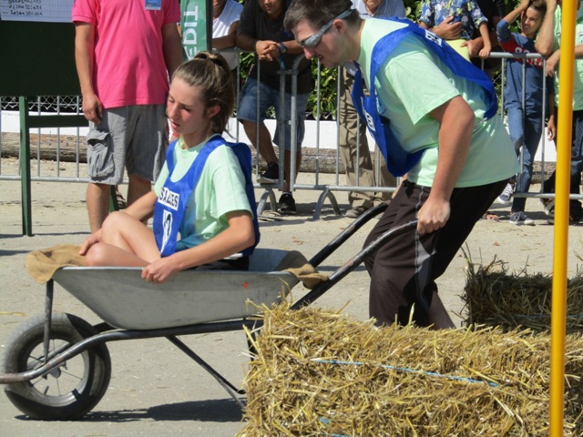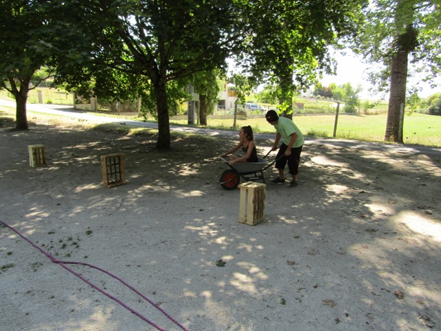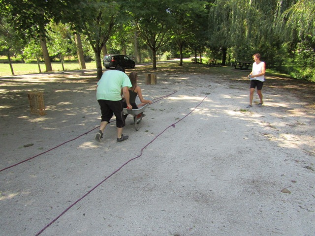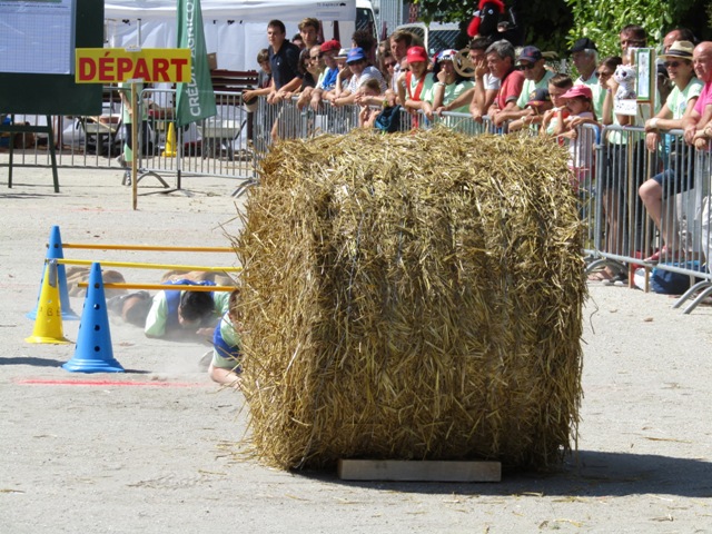 Le principe du jeu : faire un circuit en faisant passer une brouette chargée d’une botte de paille et des tuyaux sous des fils ou entre des plots…
