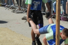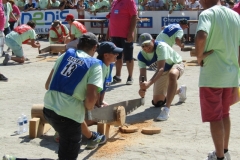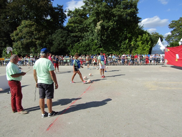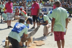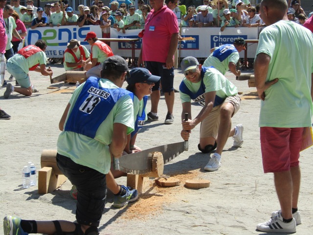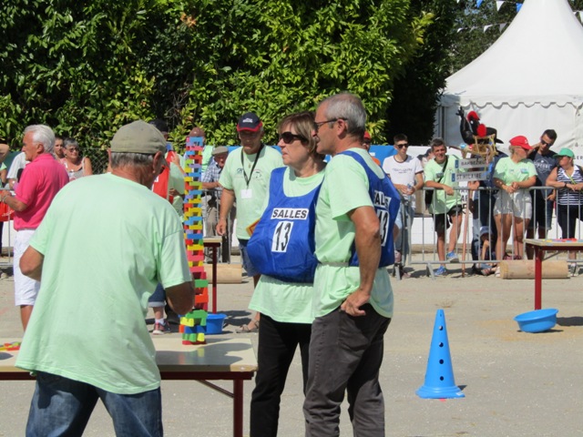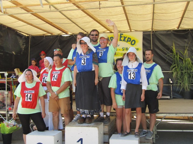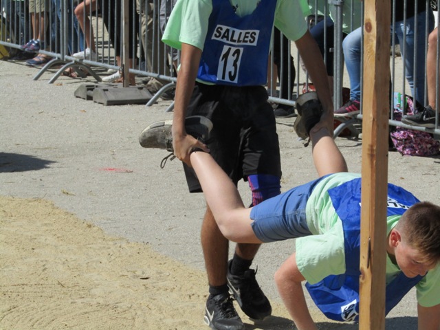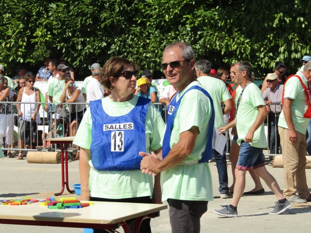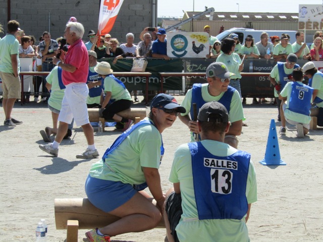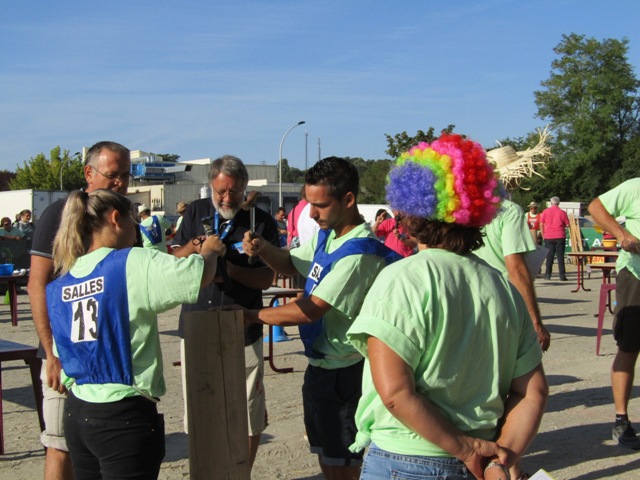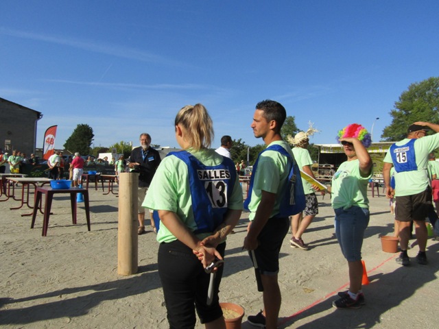 Ce jeu est ultra physique mais notre équipe est survoltée mais surtout très entraînée. Le public et les autres équipes n’en reviennent pas : les rondelles de bois s’accumulent. Aucune équipe peut suivre le rythme. Avec 13 rondelles en 10 minutes, les 3 représentants de Salles obtiennent la première médaille d’or du week-end. Il n’y a plus que 3 points d’écart avec Lachaise qui est leader depuis le début des jeux.