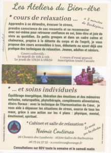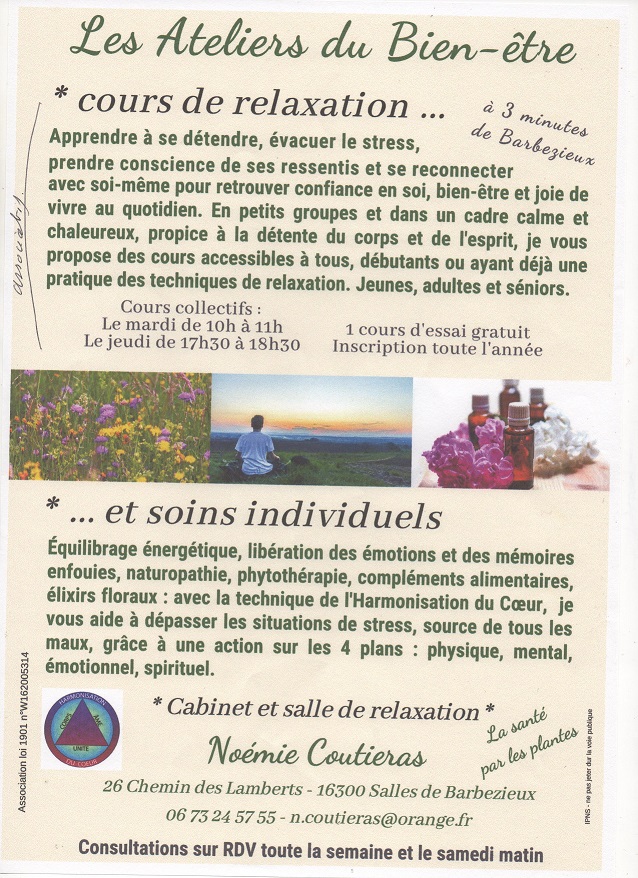 Une nouvelle association est née il y a quelque temps : Les ateliers du Bien-être. Sa responsable est Mme Noémie Coutieras.