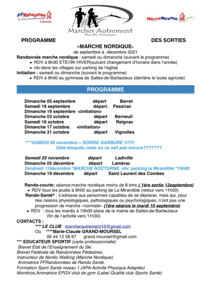 L’association Marcher Autrement reprend début septembre quelques marches déjà prévues (le programme détaillé jusqu’à la fin décembre ne va pas tarder). Informations disponibles auprès de Marie-Claude GRAND-MOURSEL.