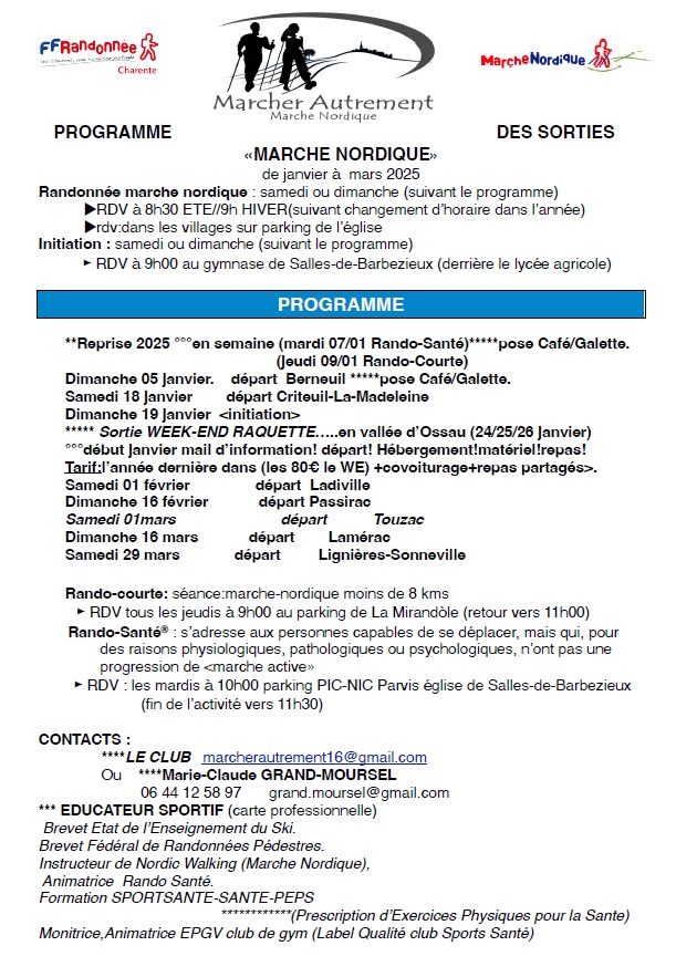 Que de mieux que la marche pour éliminer les quelques excès des fêtes de fin d’année, voici le programme de janvier à mars 2025 de l’association de marche de Salles de Barbezieux :