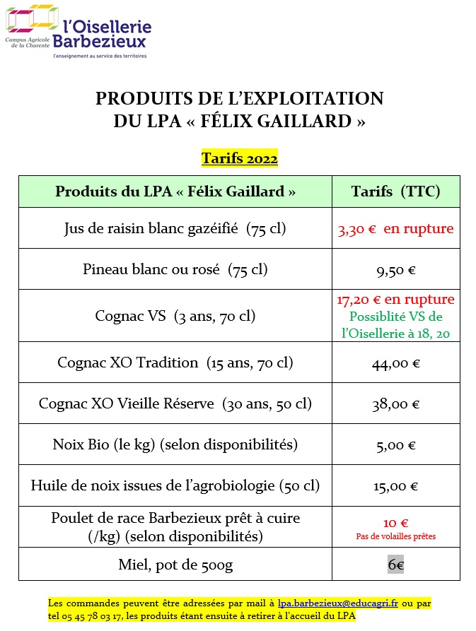 Les commandes se font si possible par mail à lpa.barbezieux@educagri.fr ou au 05 45 78 03 17 (Mme Vulfin au standard).