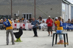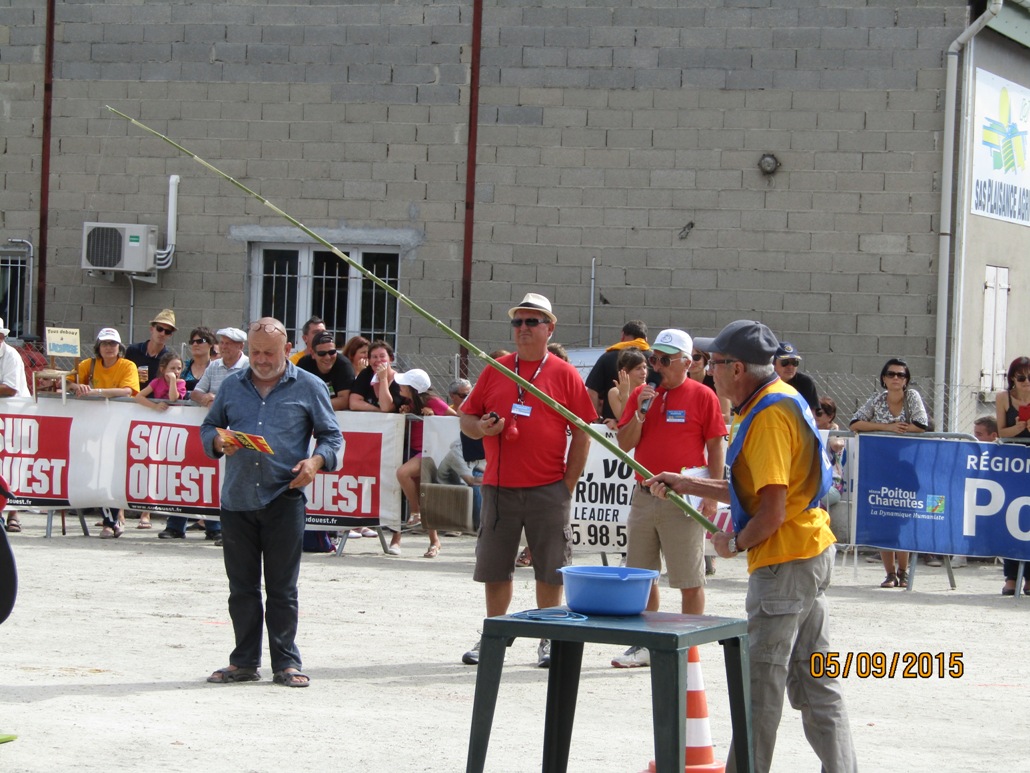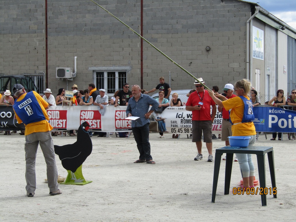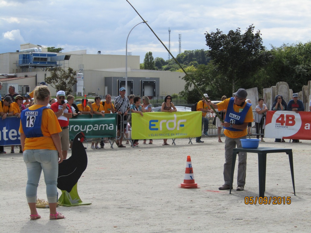 Samedi 15h : la poule de Barbezieux (un concours de pêche bien particulier : mettre le maximum de collier au tour du cou d’une poule en bois avec une canne à pêche )