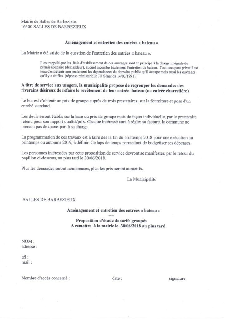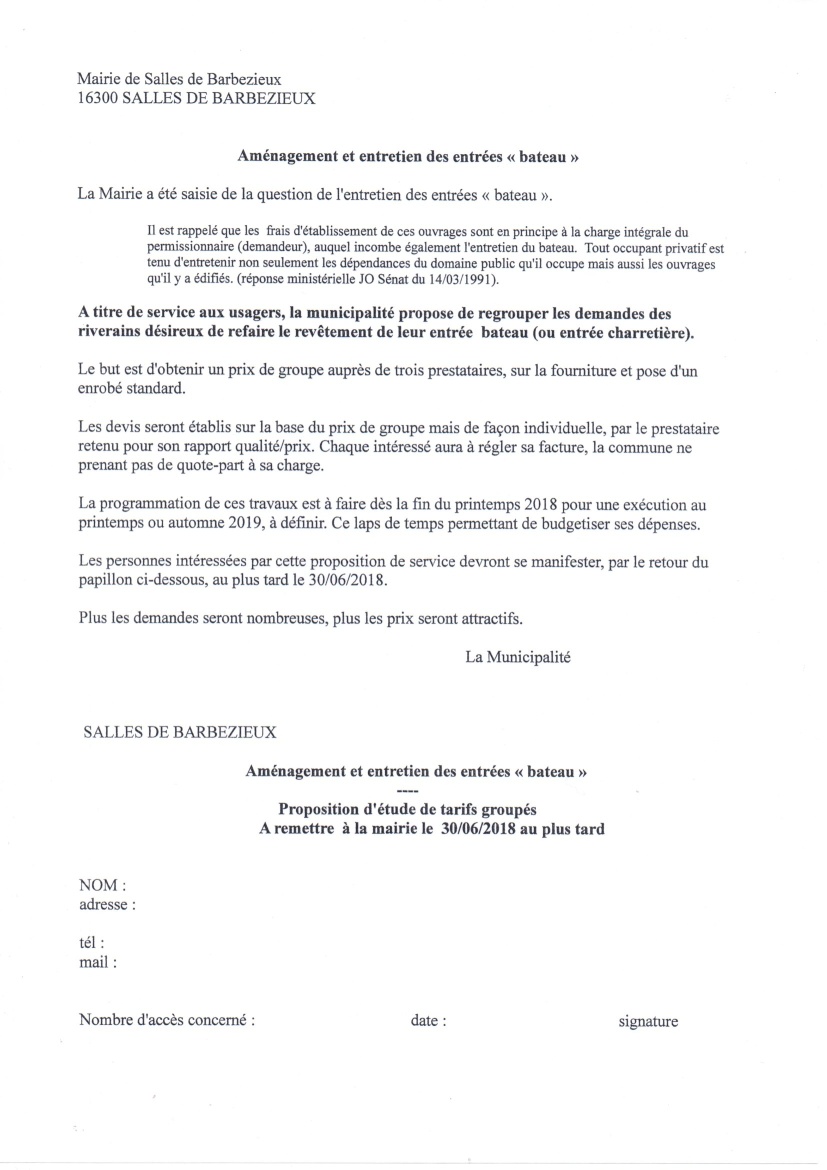 A titre de service aux usagers, la municipalité propose de regrouper les demandes des riverains désireux de refaire le revêtement de leur entrée bateau (ou entrée charretière). Le but est d’obtenir un prix de groupe auprès de 3 prestataires sur la fourniture et pose d’un enrobé standard.