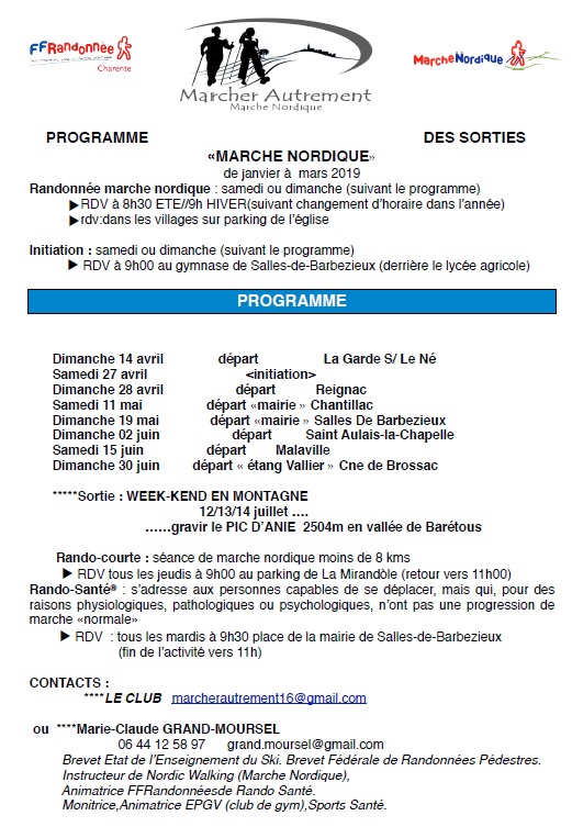 L’association de marche nordique « Marcher Autrement » prévoit de nombreuses sorties lors du 2ème trimestre 2019 . La marche nordique est une excellente activité pour éliminer les excès des fêtes de fin d’année.