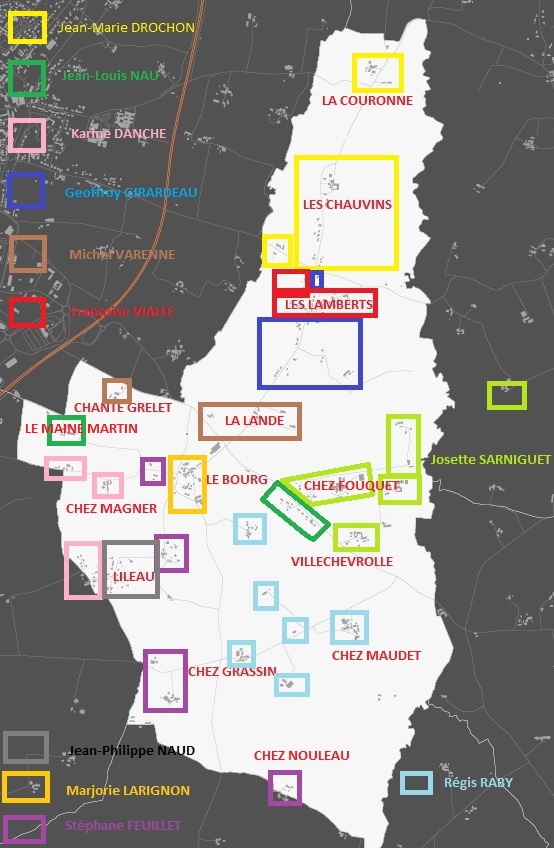 Chaque conseiller municipal est rattaché à un secteur bien défini de la commune. Pendant les 6 ans à venir, il sera en charge de la distribution des informations de la mairie sur un secteur mais également sera le lien entre la mairie et vous-même . Bien entendu, les autres conseillers ainsi que la secrétaire de mairie sont également à votre service.