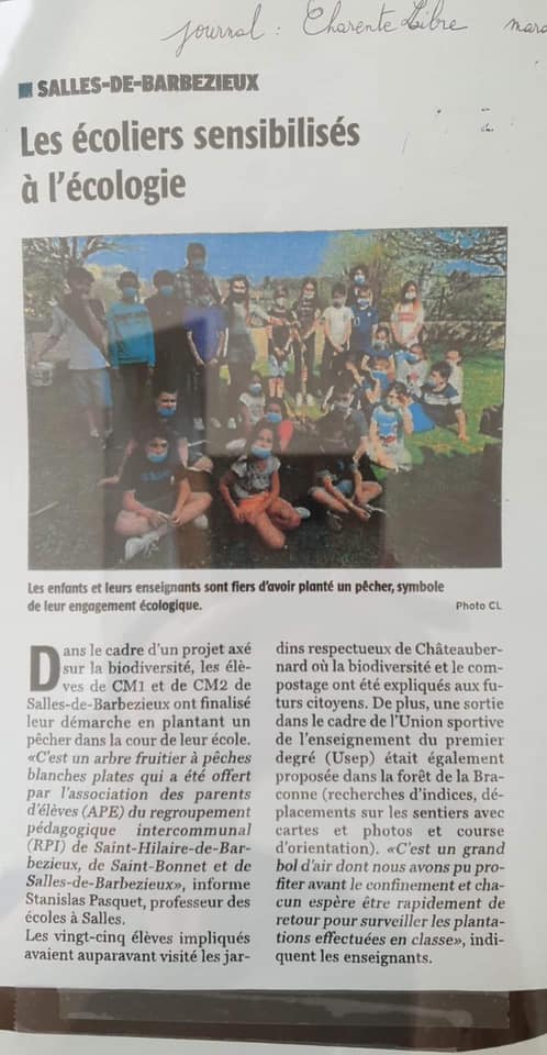 Dans le cadre d’un projet axé vers la biodiversité, les élèves de Salles de Barbezieux (CM1 et CM2) ont finalisé leur démarche en plantant un pêcher dans la cour de l’école. L’arbre à pêches plates a été offert par l’APE du RPI Saint Hilaire/St Bonnet/Salles de Barbezieux.