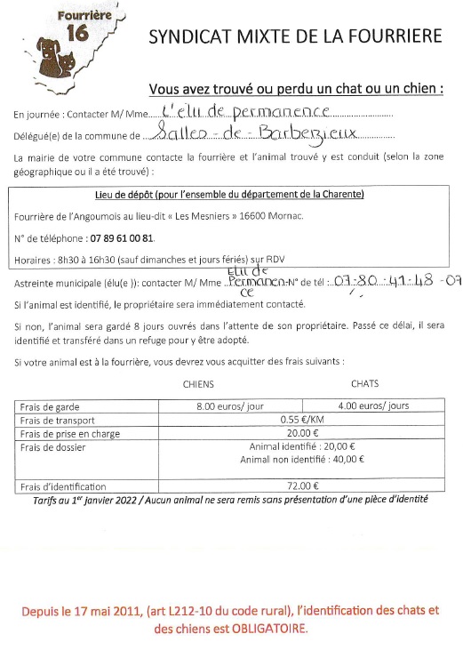 Les actualités municipales Que faire si vous trouvez un chat ou un chien? 13 janvier 2022 sallesdebarbezieux Laisser un commentaire Si vous trouvez un chien ou un chat sur la commune, veuillez suivre les instructions ci-dessous :