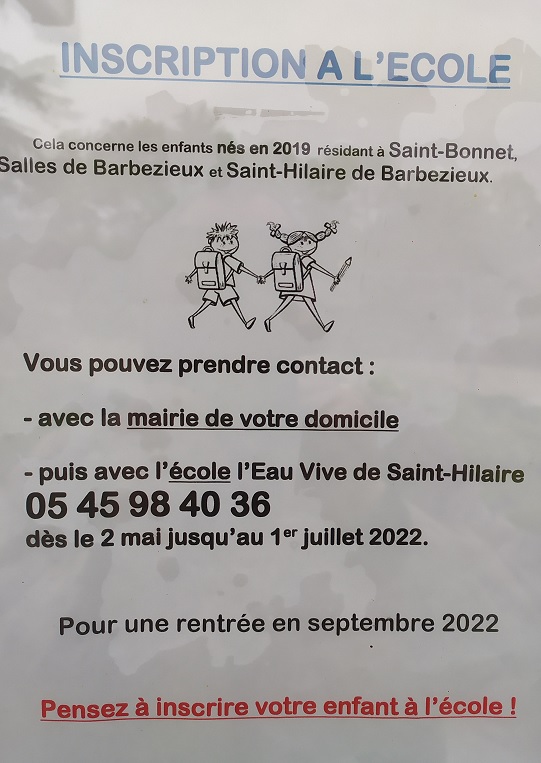 Pour cela, vous pouvez prendre contact avec la mairie de votre domicile puis avec l’école L’eau Vive de Saint Hilaire (05 45 98 40 36) dès le 2 mai et jusqu’au 1er juillet 2022.