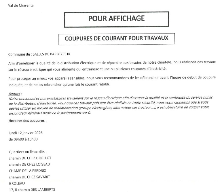 Des travaux auront lieu le 12 janvier pour améliorer la qualité de distribution de l’électricité sur la commune. Certains villages de Salles de Barbezieux seront privés d’électricité durant 1 heure.