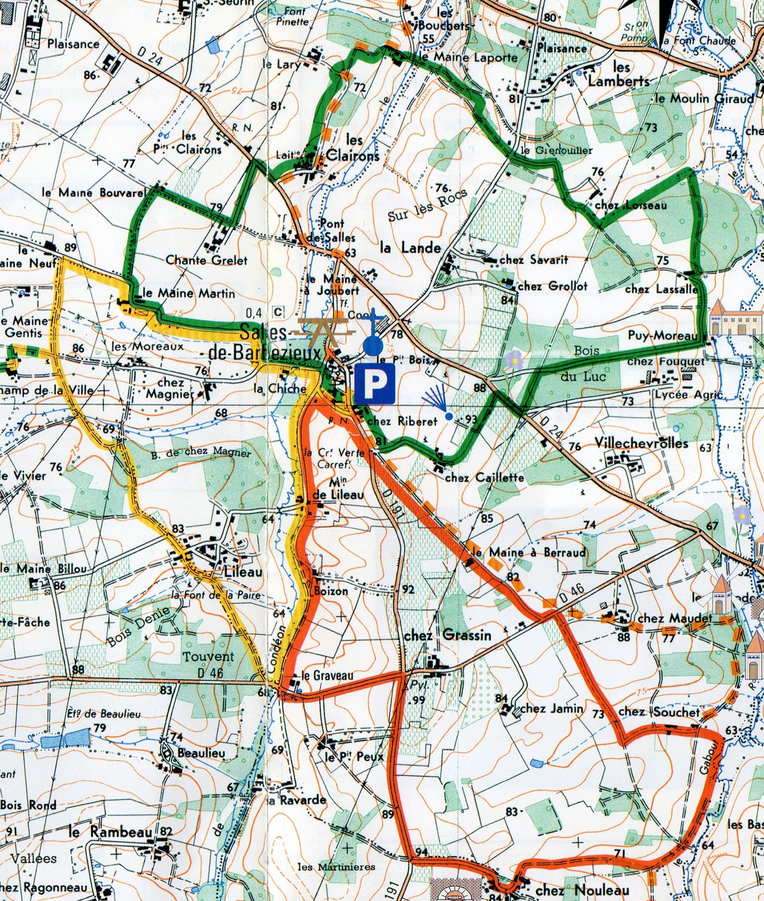 Les 2 premiers chemins viennent d’être retracés pour éviter aux promeneurs de se perdre. Le traçage du circuit de Lileau (couleur rouge) est l’aboutissement d’un projet mené par cinq élèves du LPA. Ce circuit sera inauguré le 22 mai lors de la randonnée annuelle du Comité des Fêtes. Le 2ème parcours (couleur vert clair) a été retracé dernièrement et permet de découvrir le coté Sud de notre commune. Quant au 3ème circuit, il n’est malheureusement plus pratiquable : une partie a été labourée (une variante est à l’étude)…