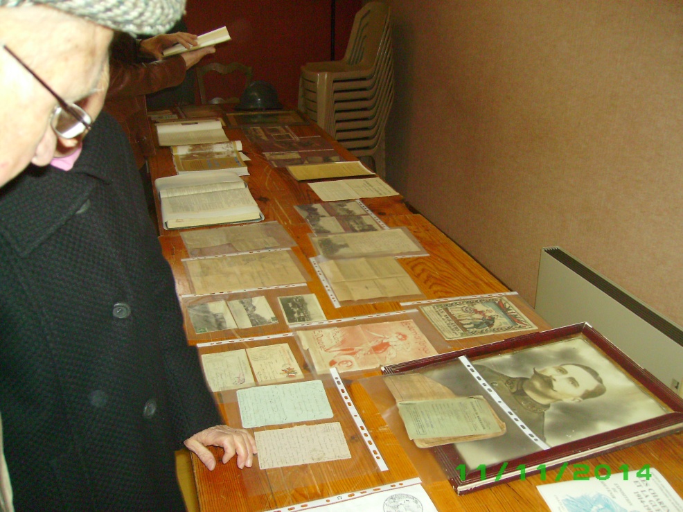 Un vin d’honneur a suivi la cérémonie à la Mairie. Une exposition sur la 1ère guerre mondiale (lettres de poilus, photos, casques, …) était visible à la Mairie. Merci à M. PLUYAUD l’organisateur de cette exposition.