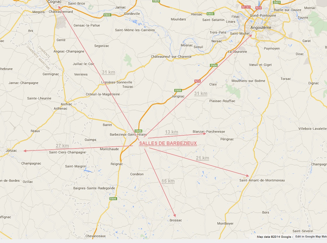 situation_geographique_restreinteSalles de Barbezieux est une commune du Sud-Charente située à 3 km au sud-est de Barbezieux et 31 km au Sud-Ouest d’Angoulême.