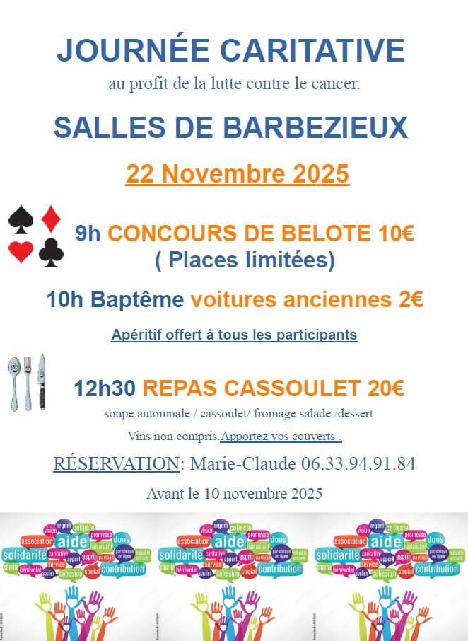 Réservation obligatoire pour toutes les activités (belote, repas, voitures anciennes) auprès de Marie Claude F